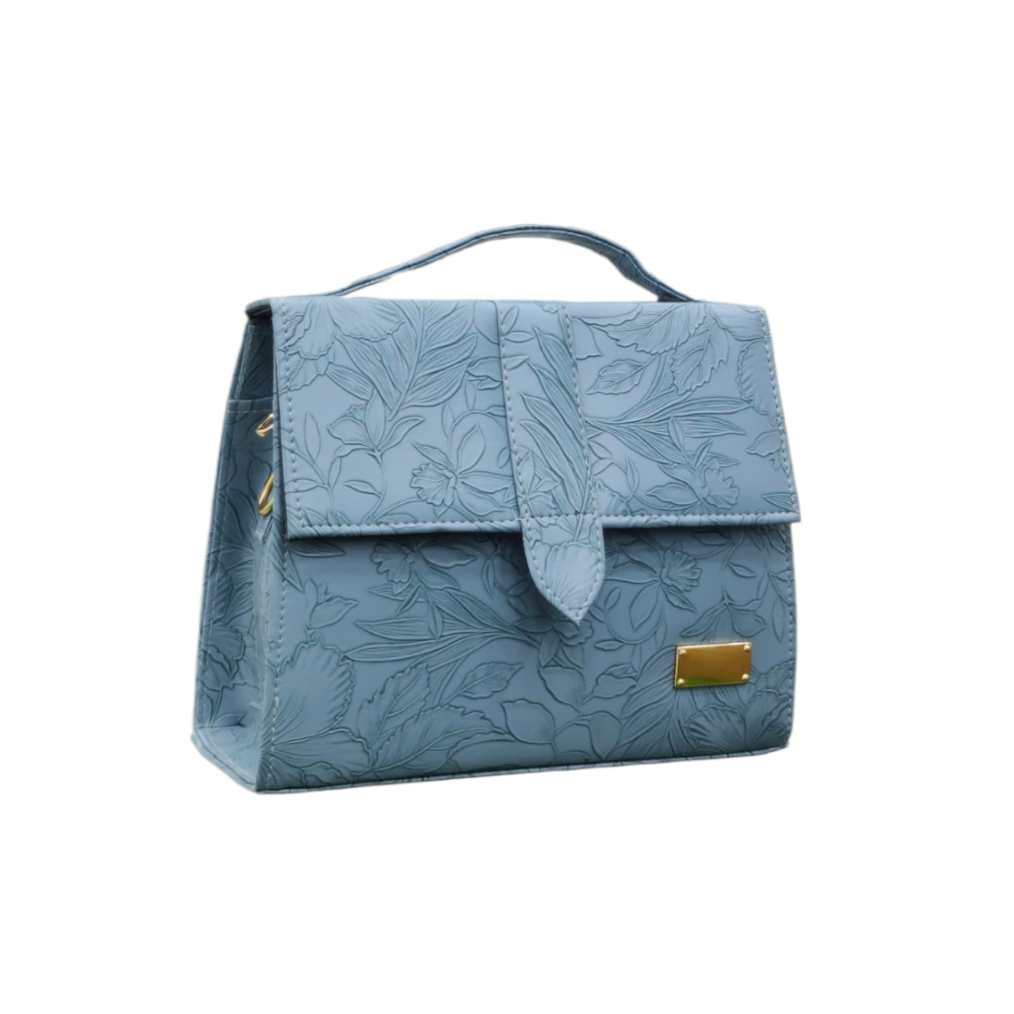 A refined balance of artistry and elegance, this embossed top-handle handbag is designed to make a subtle yet distinctive statement. Crafted in a soft muted blue tone, the structured silhouette is elevated by an all-over floral embossing that adds depth, texture, and quiet sophistication.